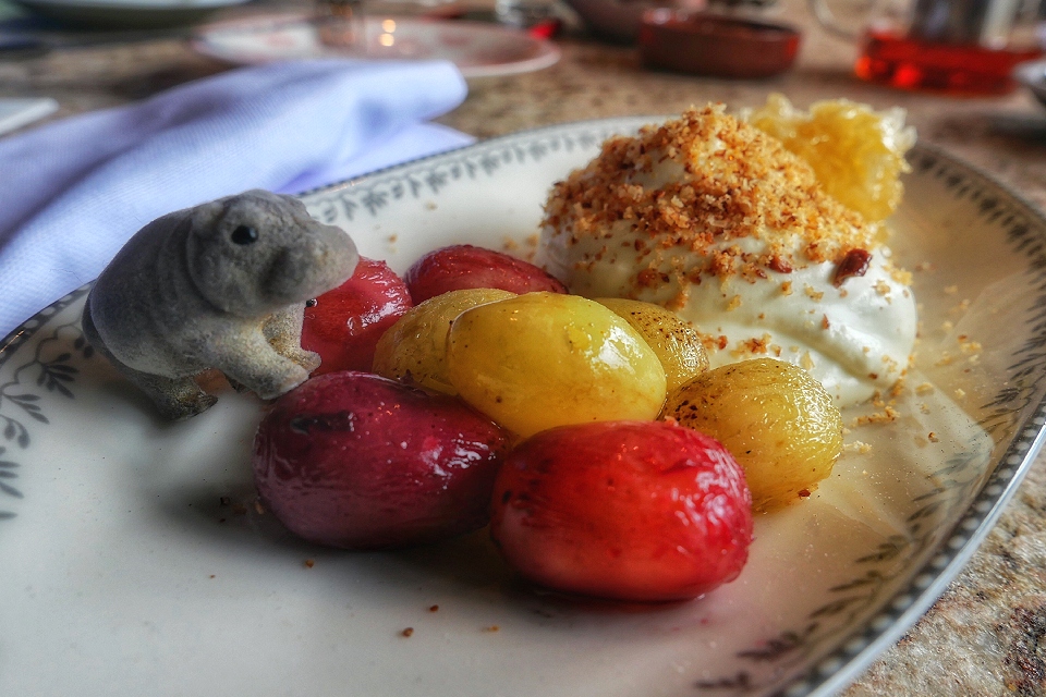 Иранская яичница — это почти шакшука, но овощная основа более жидкая и более пряная, плюс пюре из баклажана, много зелени и зернышки граната. «Folk завтрак»- импровизация на тему всего подряд: тут и «два кусочека колбаски» (с), и сыр, и жареные баклажаны с помидорами, и виноград на гриле (отличная, кстати, штука: и сюда подходит, и в десерты, это теперь новая фишка Чистякова наряду с фисташками, которые он норовит добавлять куда попало и все время по делу).