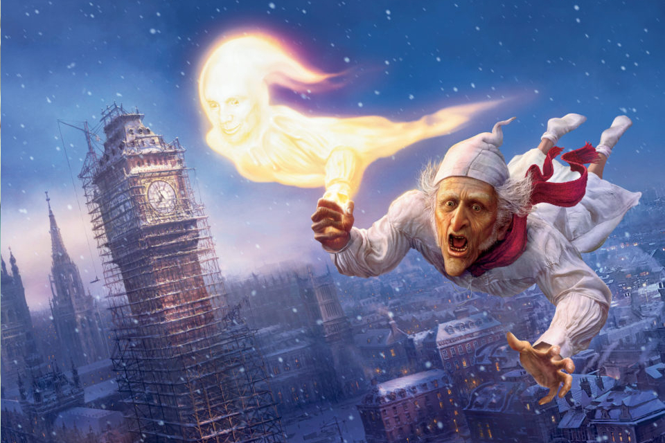 Сюжет: В канун Рождества к черствому сердцем старику-ростовщику приходит привидение — его бывший компаньон. Жутковатый гость предупреждает скрягу, что внимание нужно уделять духовным благам, а не материальным. На этом странные визиты не прекращаются. Старику по очереди являются разные сущности. Первый призрак показывает герою его прошлое. Второй гость оказывается духом настоящего и показывает картину жизни клерка, служащего ростовщику за сущие гроши. Семья этого служащего не может позволить себе даже хороший обед. Третий призрак отправляет старика в будущее, показывая, что тот умирает, но о его кончине никто не грустит.
