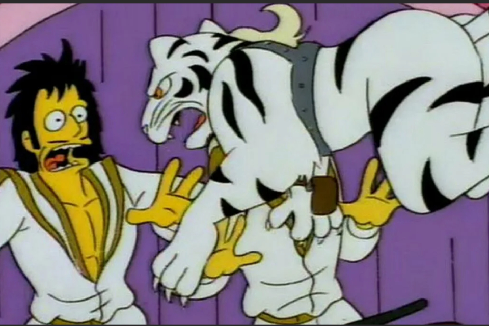 Зигфрид Фишбахер и Рой Хорн были легендарными американскими артистами цирка, работали с животными. В одном из эпизодов «Симпсонов» на них нападал дрессированный белый тигр. Десять лет спустя стало не до смеха: белый тигр по имени Мантакоре во время представления напал на Роя, вцепился зубами ему в шею и поволок за кулисы. Потом еще выяснилось, что у Роя случился инсульт – то ли до, то ли во время нападения зверя. По дороге в больницу артист сумел выговорить: «Только не причиняйте вреда Мантакоре, это великий кот!» Рой в итоге выжил, заново научился гулять и разговаривать (хотя карьера его закончилась). Потом он утверждал, что Мантакоре пытался спасти ему жизнь: сообразил, что с хозяином произошло что-то не то (то есть апоплексический удар), и постарался утащить в безопасное место.