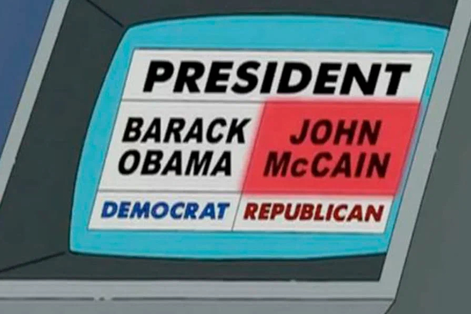 На самом деле, если кто помнит, соперником Обамы в том году стал Джон МакКейн (эпизод «Симпсонов» вышел до того, как это определилось). А Ромни стал его соперником на выборах 2012 года. И в Пенсильвании нашлась именно такая сумасшедшая машина – избиратели тыкали в экран рядом с фамилией Обамы, а голос уходил к Ромни. Был большой скандал, в результате которого и вспомнили это предвидение.
