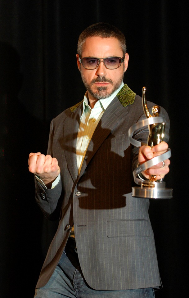 Роберт Дауни-младший, облаченный в серую футболку и спортивные штаны, разгуливает по знаменитому 55-комнатному особняку Грейстоун в Беверли-Хиллз, представляя, что он Элтон Джон.