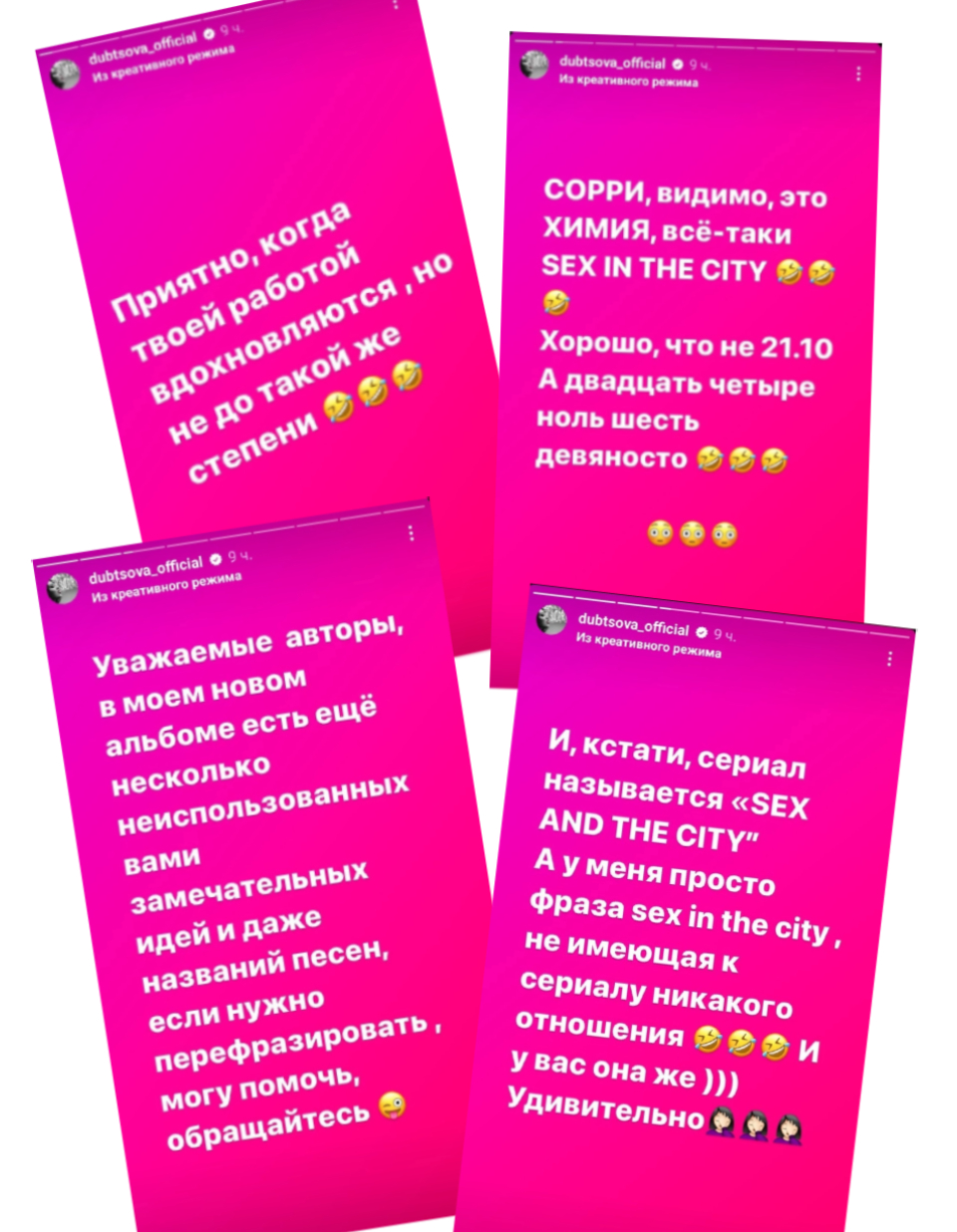 «Приятно, когда твоей работой вдохновляются, но не до такой же степени. Уважаемые авторы, в моем новом альбоме есть еще несколько неиспользованных вами идей и даже песен. Если нужно перефразировать, могу помочь, обращайтесь», – написала Ирина Дубцова в сторис.