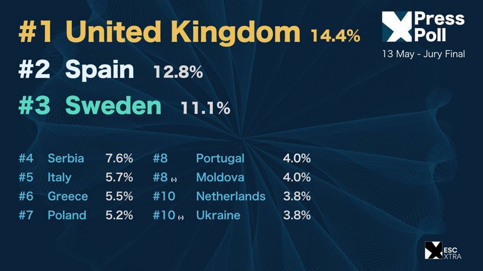Перед финалом Евровидения традиционно голосует и пресса. И здесь Украины вообще не было в пятерке. На первое место журналисты ставили Великобританию, на второе – Испанию, на третье – Швецию.