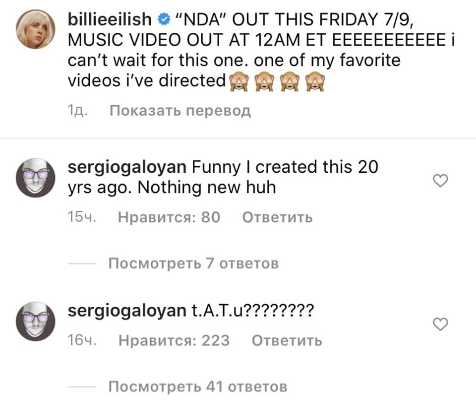 Поклонники «Тату» принялись писать под постом Билли Айлиш: «t.A.T.u. «Show Me Love». Многие жалуются, что их сообщения якобы стирают представители американской звезды. Среди комментаторов оказался и Сергей Галоян, один из самых известных авторов «Тату», перу которого принадлежит и музыка к «Покажи мне любовь».