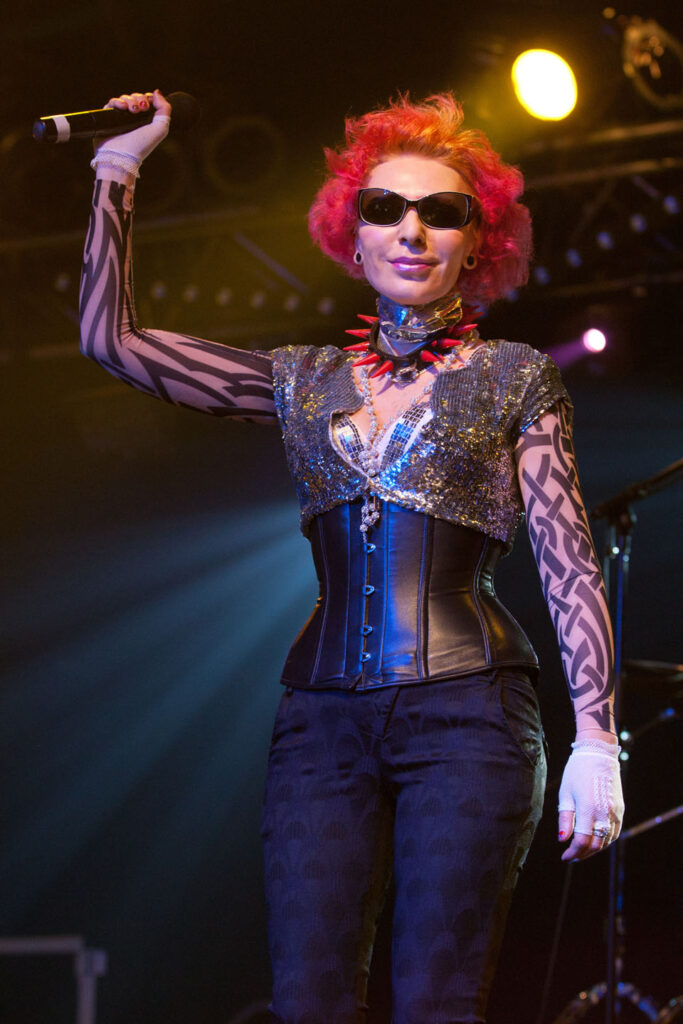 На июньском концерте в Зеленом театре на ВДНХ шоувумен украсила лицо сусальным золотом, а на фестивале «Стереолето» в Санкт-Петербурге пела, завернувшись в плаще с изображением карты мира.