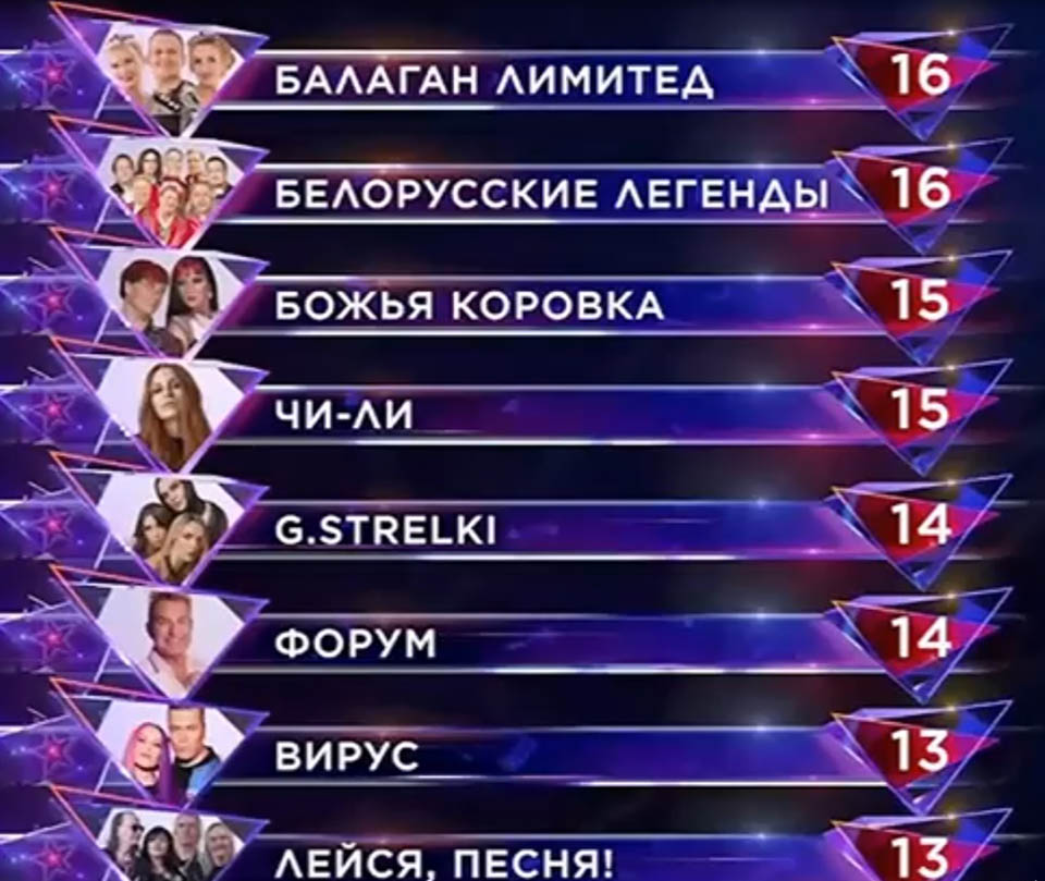 По итогам двух конкурсных дней шоу «ВИА Суперстар» турнирную таблицу возглавляют «Балаган Лимитед» и «Белорусские легенды». На последнем месте – группа «Вирус» и «Лейся, песня». Если на следующей неделе кто-то из аутсайдеров вновь окажется последним, то этот коллектив покинет проект.