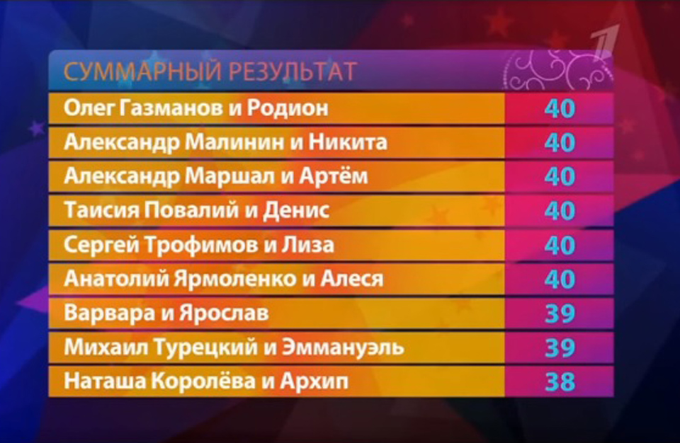 По итогам двух конкурсных дней (в первом судьи ставили «5» всем без исключения) ситуация такая. На девятом месте Наташа Королева и Архип Глушко (38 баллов). На предпоследнем месте – Турецкие и Варвара с Ярославом. У остальных участников по 40 баллов. Очень ждем, когда из проекта начнут выбывать участники, как это было в предыдущих сезонах. Так появится хоть какая-то интрига.