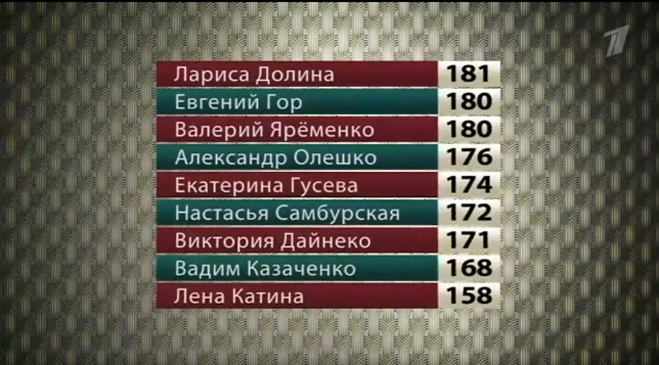 Таким образом, в девятом выпуске шоу «Три аккорда-7» пары Дайнеко-Савичева и Долина Милимеров получили по 21 баллу. Все остальные дуэты – по 20. И если раньше в проекте лидировали три участника с одинаковым количеством баллов, то теперь турнирную таблицу возглавляет одна Лариса Долина, заработавшая 181 балл. У ее ближайших преследователей – Евгения Гора и Валерия Яременко по 180 баллов. На последнем месте Лена Катина – 158 баллов. И экс-татушка уже не поднимется выше, так как у Вадима Казаченко, который находится на предпоследнем месте, на 10 баллов больше – 168.