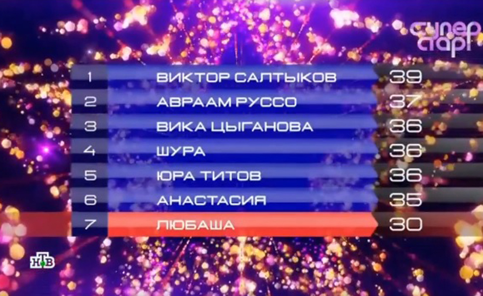 Согласно правилам второго сезона «Суперстар! Возвращение», в конце каждого выпуска проект покидает участник, набравший минимальное количество баллов. Это ожидаемо была Любаша с 30-ю баллами. Причем Татьяна Заслужная, понимая, что вылетит именно она, не вышла на подведение финальных итогов, как это подобает правилам и как это дедали все, кто уже покинул проект: Наталия Власова, Алена Апина, Юлиан. Лидером «Суперстара» остается Виктор Салтыков – 39 баллов. В следующем эпизоде под угрозой вылета Анастасия, которая занимает последнее место после Любаши.