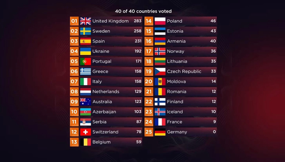 Жюри видело на первом месте Сэма Райдера из Великобритании. Однако после того как были озвучены голоса зрителей, бородач опустился на второе место. В любом случае, в этот вечер сбылась мечта 32-летнего исполнителя, ведь он давно грезил о Евровидении. Райдер с детства увлечен музыкой. Его кумирами были Элтон Джон и Фредди Меркьюри. Зрителей Еровидения покорила его проникновенная композиция «Space Man». Кстати, Райдер признавался, что он верит в инопланетян и однажды он якобы «видел НЛО».