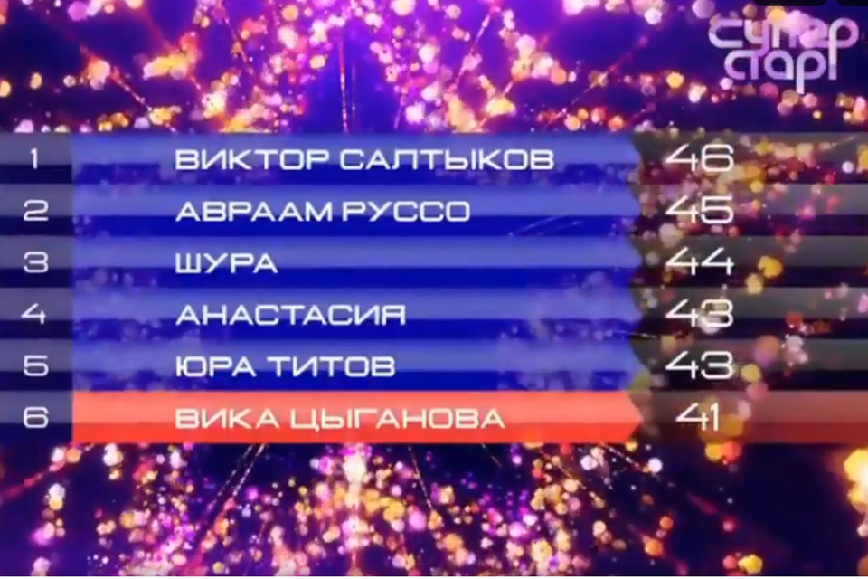 По результатам конкурсного дня высшие оценки получили 3 исполнителя – Анастасия, Авраам Руссо и Шура. А вот по итогам всех программ лидером является Виктор Салтыков. Самая низкая оценка была у Вики Цыгановой, которая и покинула проект.