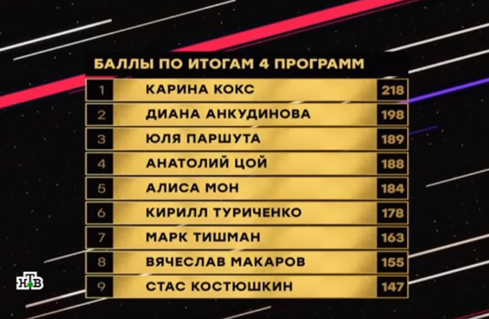 По итогам выпуска первое место с большим отрывом заняла Карина Кокс (74 балла). Последней стала Юлия Паршута – 30 баллов. Суммируя результаты четырез программ, результаты следующие. На первом месте – Карина Кокс, на втором – Диана Анкудинова, на третьем – Юля Паршута. Последний – Стас Костюшкин.