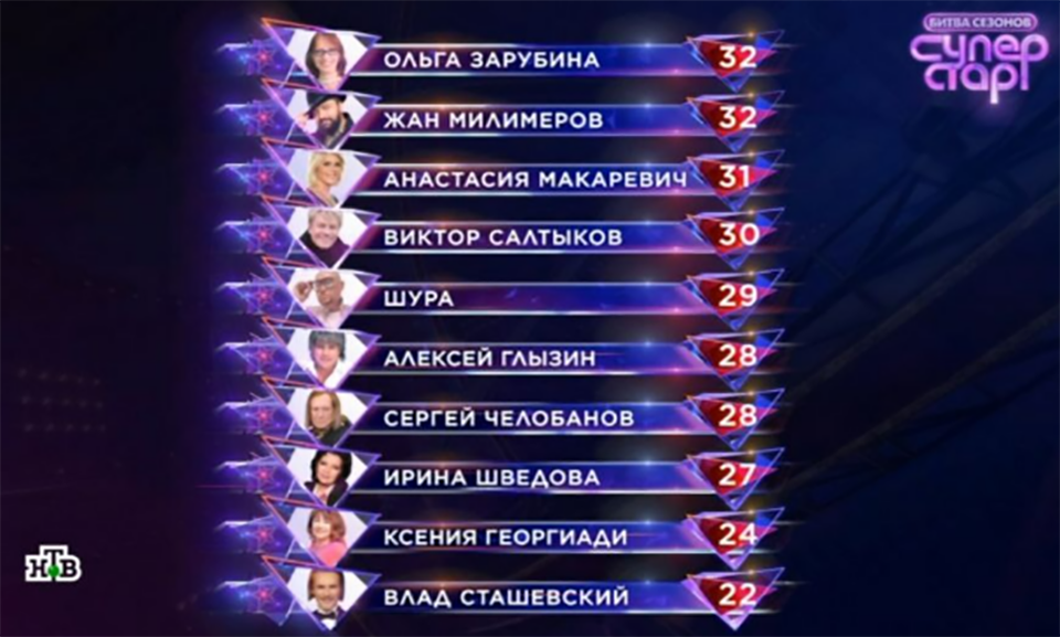 По итогам четырех выпусков шоу «Суперстар! Битва сезонов» турнирную таблицу возглавляют Ольга Зарубина и Жан Милимеров – по 32 балла. На последнем месте вновь оказался Влад Сташевский (22). Влад мог покинуть проект, но зрители дали ему иммунитет. Ранее Сташевского спасали члены жюри.