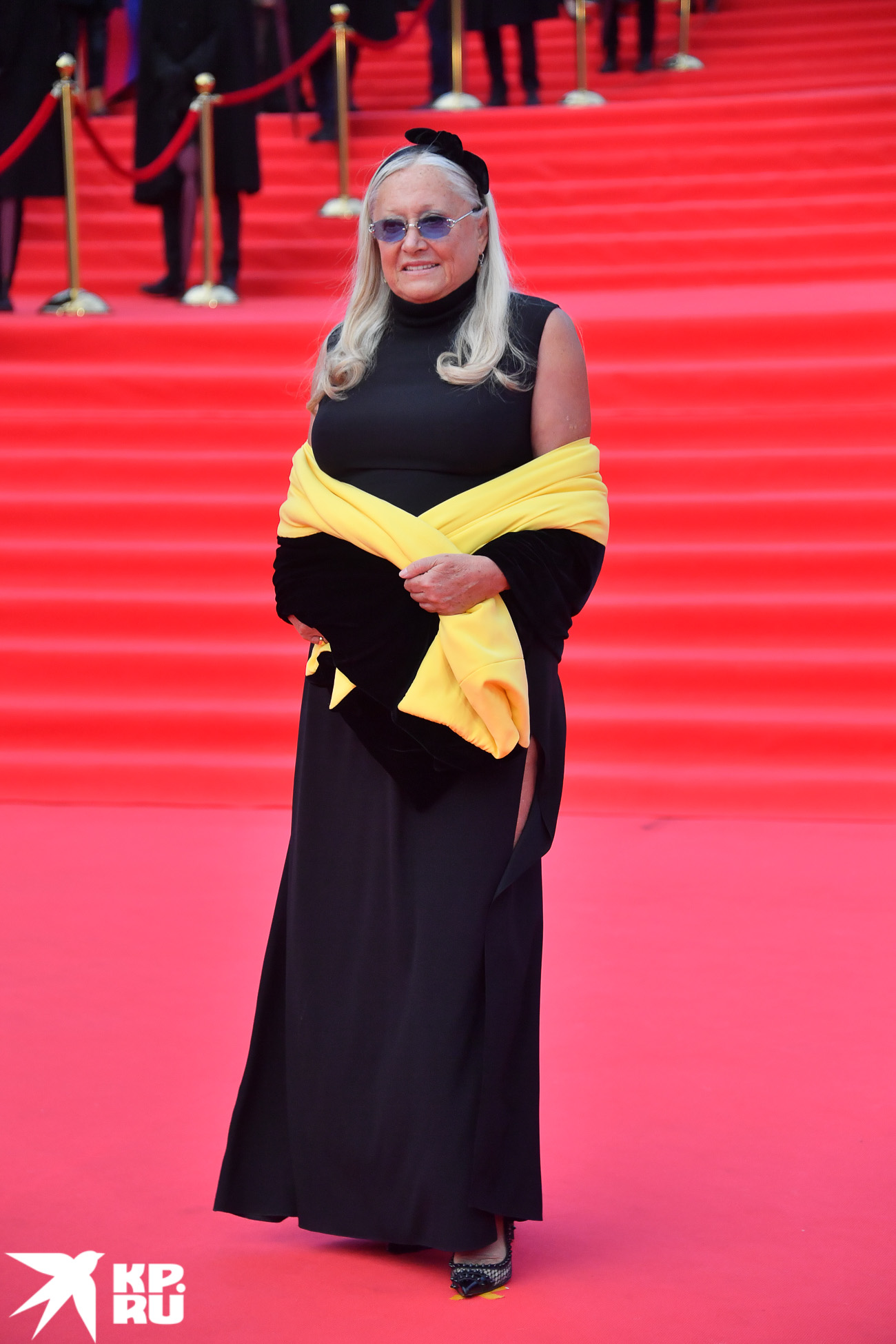 Татьяна Михалкова дополнила черное платье ярко-желтым палантином.