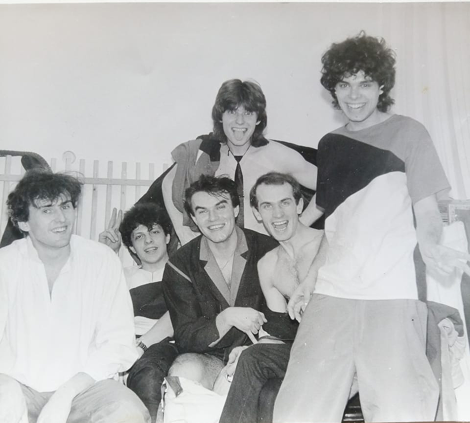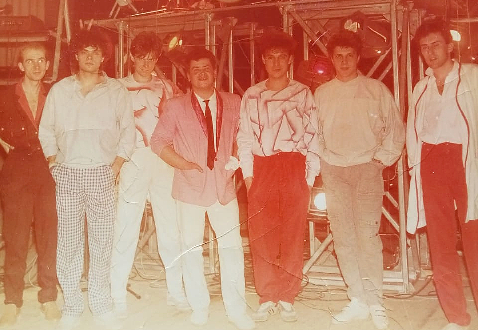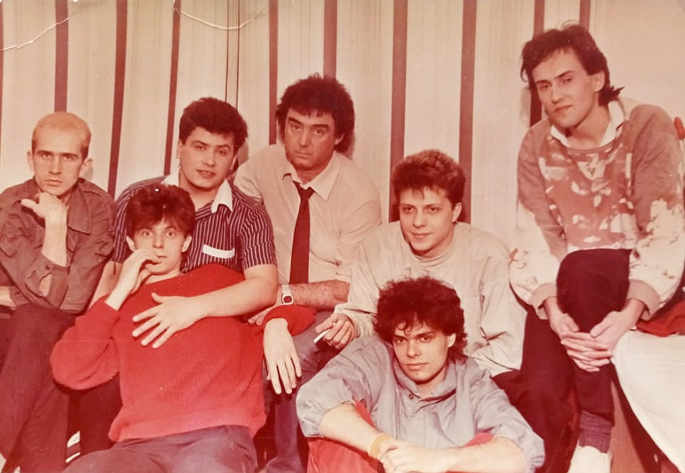 И да, к слову о «Любэ». Как вспоминает Николай Сафонов (на снимке он крайний слева), будущие хиты этой группы Матвиенко начинал репетировать еще с музыкантами «Здравствуй, песня!» Но в 1985 году в имидже Николая Расторгуева, как мы видим, еще нет ни гимнастерок, ни сапогов. Матвиенко — крайний справа.
