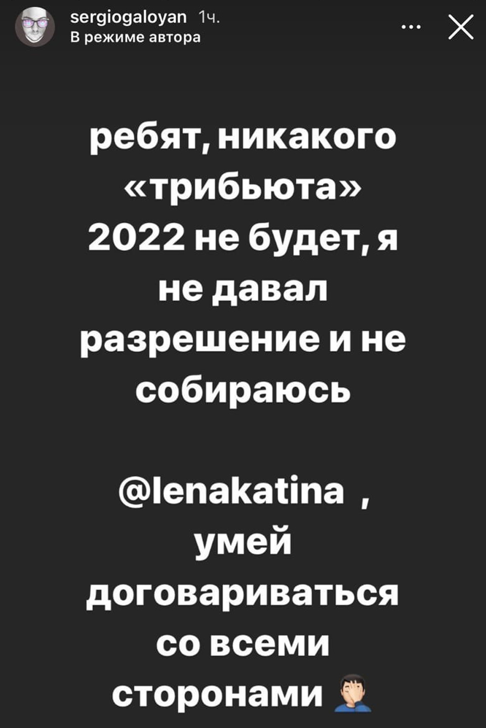 – Ребят, никакого «трибьюта» 2022 не будет, я не давал разрешение и не собираюсь. Лена Катина, умей договариваться со всеми сторонами, – написал у себя в сторис Сергей Галоян.