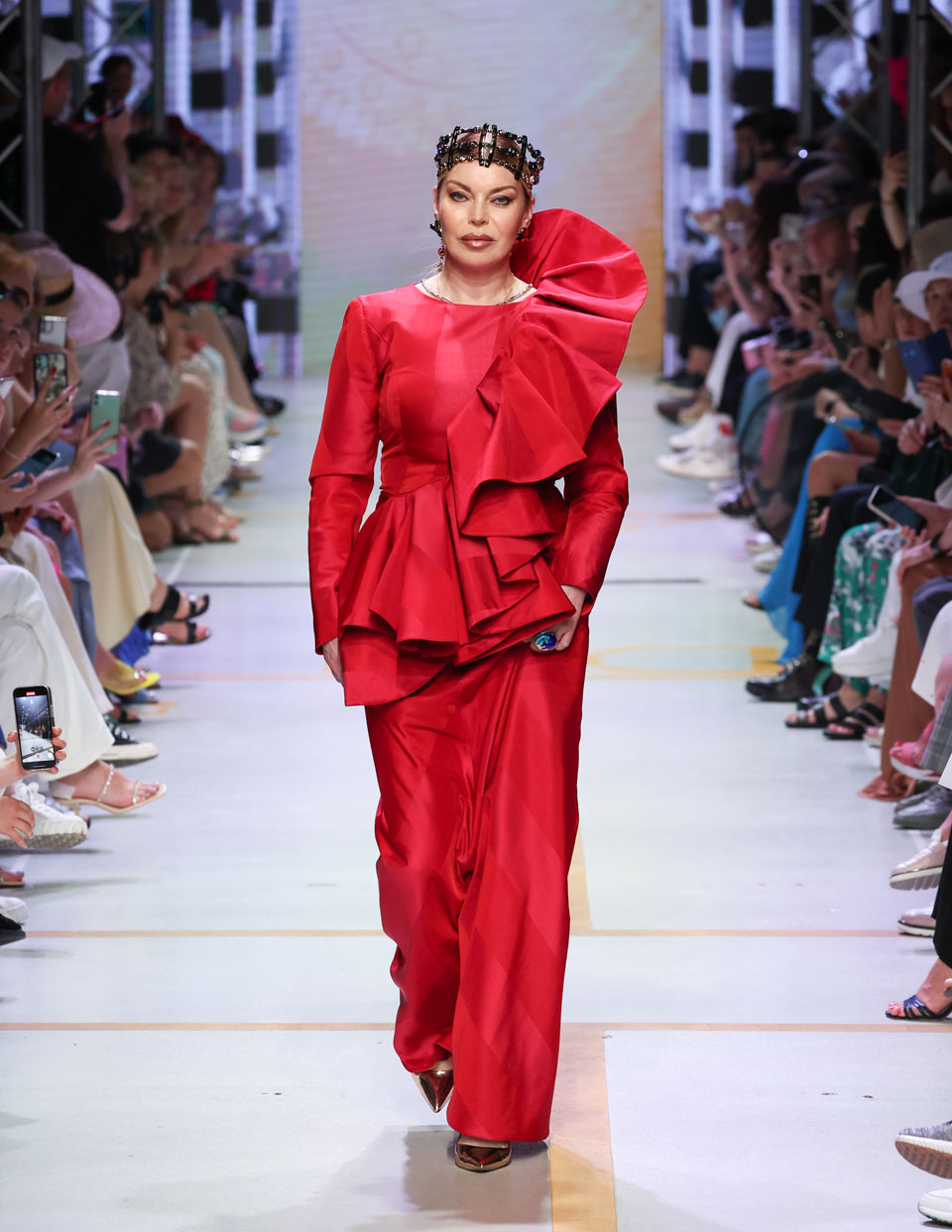 В финале показа на подиум в эффектном красном платье вышла Лада Дэнс. И без того роскошный наряд украсили впечатляющие аксессуары – массивные серьги, яркое кольцо и необычное украшение на голове.