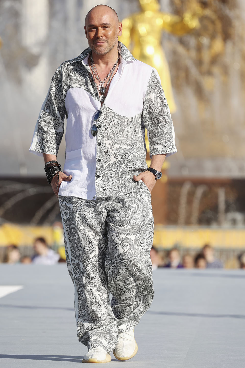 Актер выбрал для выхода в свет легкий черно-белый костюм с необычным ассиметричным принтом. Многочисленные аксессуары придали образу еще большую расслабленность – то что нужно для неспешных прогулок по столице!