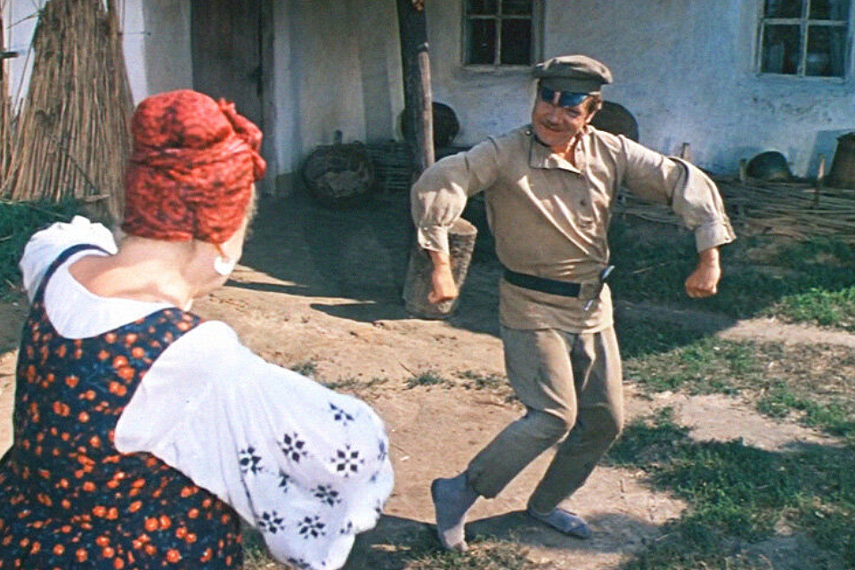«Приготовьтесь, фрау-мадам. Я урок вам первый дам. Надо к небу поднять глаза и запрыгать, ну как коза. Ну-ка, смелее, напрямик, с вашей фигурой это шик. Раньше так, потом вот так. Да, я плясать мастак», – дает танцевальный мастер-класс Горпине Дормидонтовне артиллерист Яшка.