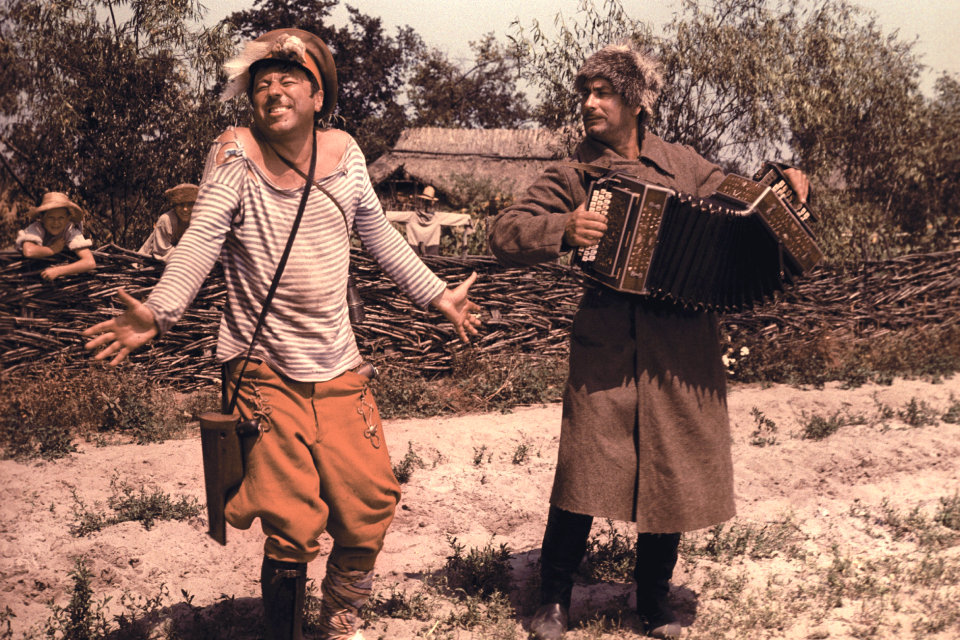Песню поют влюбленные пастух Андрейка и Яринка. «У дороженьки стояла алая калина. В путь дорожку провожала казака дивчина… На коня казак садится. Говорит: пора проститься. Будь счастлива и здорова, девица черноброва», – звучит классическая казачья песня.