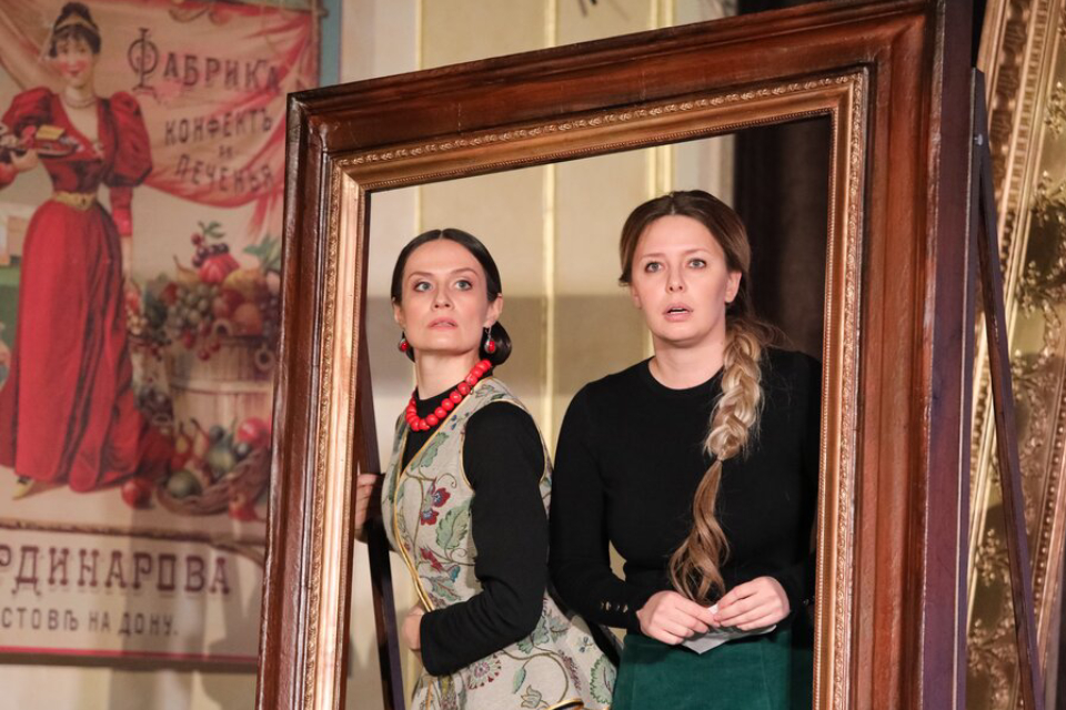 Только окунется зритель в переживания купеческих девиц, как появляется директор, в роли которого выступила Алина Ивах, и начинает распоряжаться актерами-работниками музея, устраивая хороводы и исполняя песни под виртуозную балалайку Дмитрия Куличкова. Именно благодаря этому ходу не возникает ощущения оторванности одного мира от другого — появляется переплетение. И уже галерея становится частью декора купеческой жизни. Герои заглядывают с выставочных картин в нашу реальности. Тут-то и реализуется режиссерский ход — Ольга Матвеева показывает брак и семейную жизнь на примере работы. Купец, он же в реальности охранник, сторожит и одновременно волнует рабочий процесс, как властный муж, который пытается убедиться в верности жены, засматривающейся на проезжающих военных. Бухгалтер и экскурсовод, уставшие трудиться, мечтают о свободе и в итоге сменяют черную униформу сотрудников на яркие цветастые костюмы, как и героини пьесы, измученные надзором мужа, брата и строгой матери, надевают парадные платья и уезжают гулять в Сокольники.