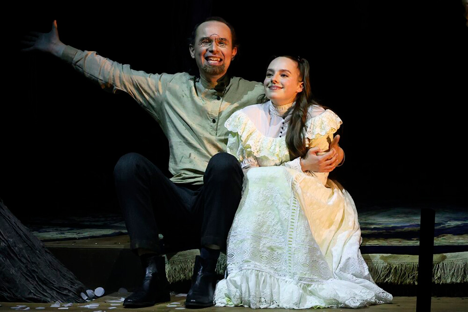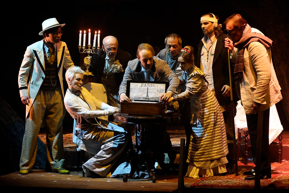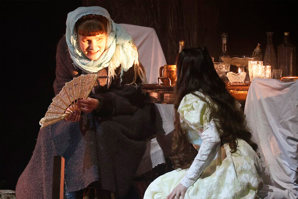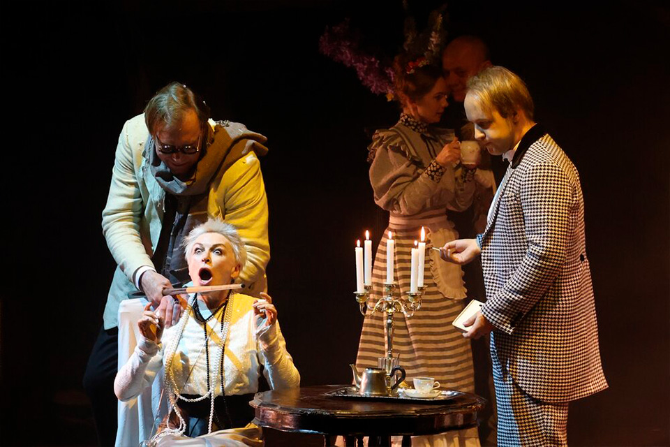 Вильдан Фасхутдинов в роли Лопахина добавляет постановке острой, почти болезненной современности. Он воплощает новую, прагматичную и безжалостную эпоху. Его выход на сцену после покупки сада, а затем гомерический смех, переходящий в дерзкий прыжок в зрительный зал (он перешагивал через ряды, наступая на подлокотники кресел) — это не просто игра. Это демонстрация нового типа человека, который безжалостно сметает старый мир, проходя по головам. Марина Дианова в роли Шарлотты Ивановны, в клоунских шароварах и с безумным бантом, выглядит как существо, словно сошедшее со страниц мистической повести.