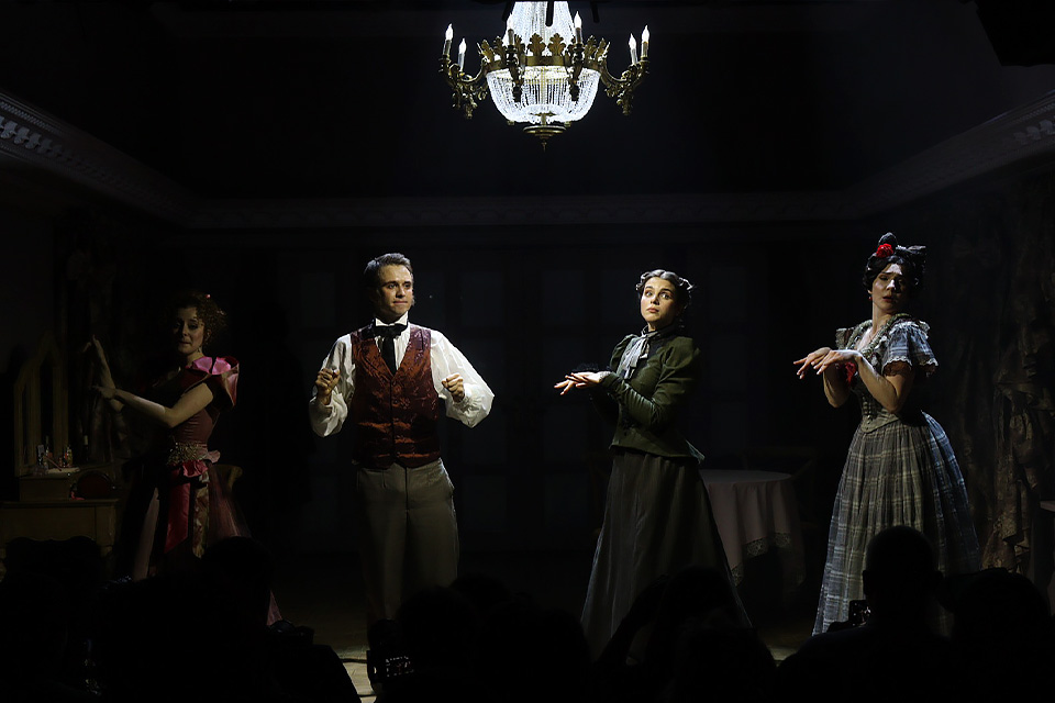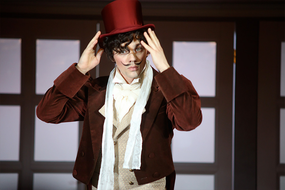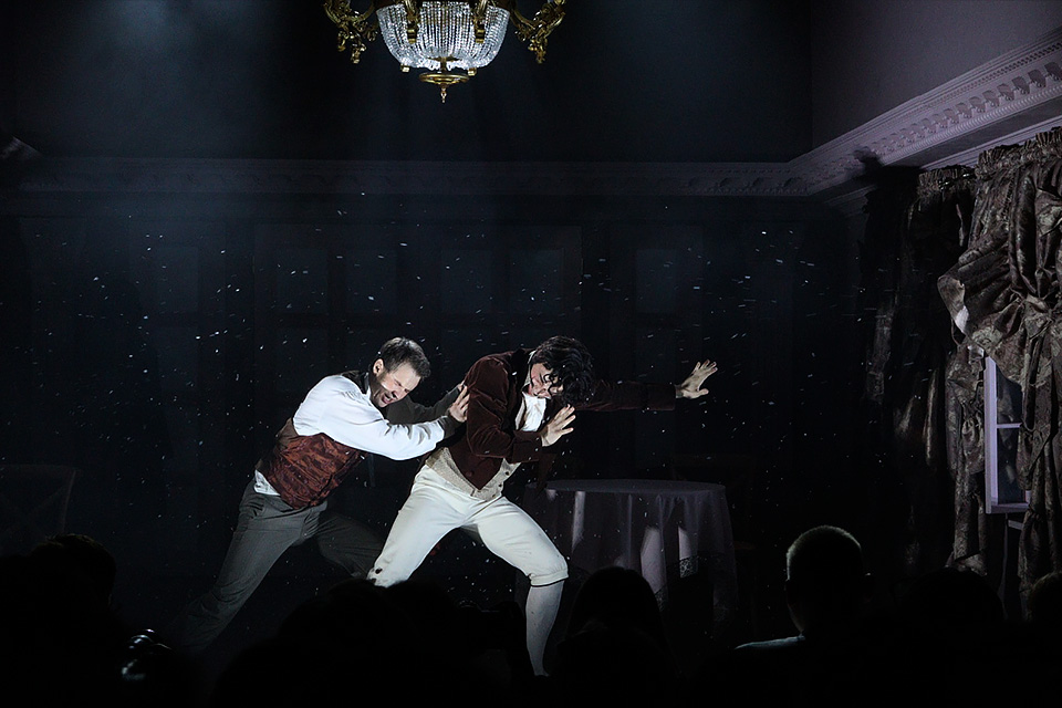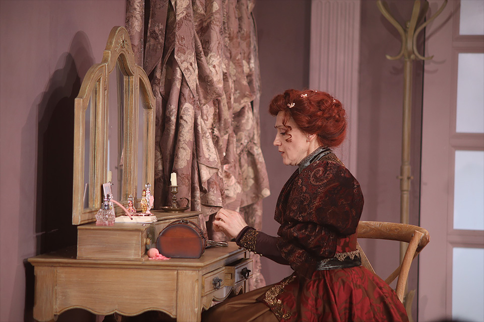 Жанр водевиля диктует свои правила: здесь эмоции нарочито преувеличены, а ситуации доведены до буффонады. Визуальная составляющая спектакля поддерживает это ощущение: Историческая сцена превратилась в залу старинного особняка, потолок которого украшен лепниной, а нежно-розовые стены прикрыты драпировкой атласных штор. Костюмы и прически дам, кринолины, изящные платья, фраки, кудри и парики — всё старательно приведено в соответсвие моде эпохи Соллогуба.