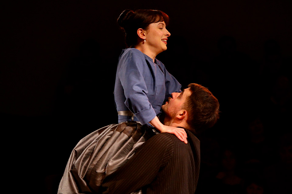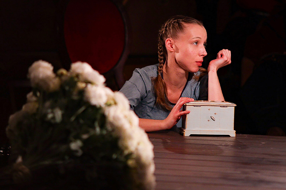 На основной сцене «Сферы», имеющей форму арены, особенно интересно наблюдать за актерами: они обращаются к разным сторонам зала, находясь со зрителем буквально в одной плоскости. На первый взгляд, перед нами классическая постановка с изящными костюмами и масштабными мобильными декорациями. Зритель мгновенно переносится из тесной каморки за кулисы театра или на вокзал к уходящему поезду. Однако спектакль наполнен современной, цепляющей эмоциональностью. Артисты произносят реплики XIX века так естественно, словно они написаны сегодня.