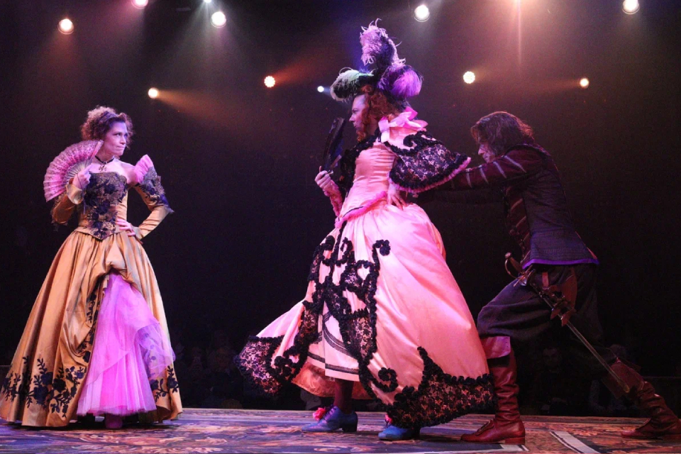 Так, на премьере комедии 17-го века, привычный большой зал оказался разделён простынями-занавесом на три части. В середине расположилась сама сцена, а зрители заняли места по обе стороны от неё — необычный и неожиданный формат для театра.