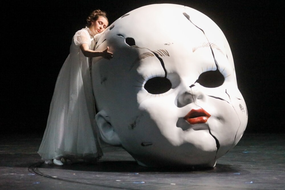 Музыку к спектаклю написал композитор Павел Акимкин. Артисты на сцене двигаются в громоздких масках-головах. Ну, действительно, это же маскарад! Между тем, зрители не могут отделаться от мысли, что это просто безликие и равнодушные существа, кружащиеся в завораживающем вальсе. Зеркала, ниши создают впечатление лабиринта, в которых должны заплутать и обязательно заплутают все герои.