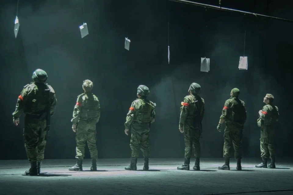В Театре Российской армии актеры и зрители располагаются так, что действие происходит чуть ли не на расстоянии вытянутой руки. Периодически герои постановки проходят за пределы сценического пространства и по-разному взаимодействуют со зрительным залом. Основное время аудиторию окутывает тьма и ключевая задача артистов — отражать блеск сцены на пустые зрительные кресла. С ходом спектакля проникаешься ощущением постоянного общения солдат со смертью и пониманием, что не всем удается с ней договориться. А эти пустующие места воспринимаются как занятые теми бойцами, что не сумели вернуться домой.