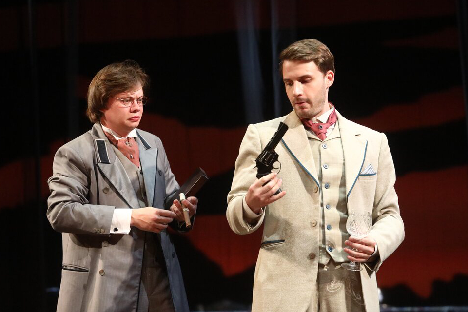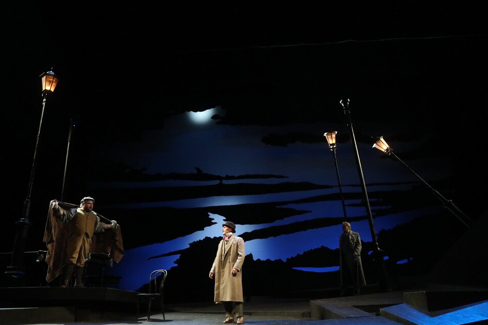 Желая создать что-то свежее и новое, режиссёр спектакля Александр Вельмакин обращается к декорациям, наделяя их символическим содержанием. Созданная в стиле модерн сцена представляет собой разноуровневую платформу из ступеней, предстающую одновременно и городским бульваром, и верандой, и палубой парохода, и образом дисгармонии и замкнутости героев пьесы. Действующие лица постоянно нарочно задевают ступени, словно спотыкаются на несогласии с позицией собеседника. Острые углы сразу намекают зрителю о трагизме истории, сотканной из конфликтов и неудовлетворённости. Уходящие под откос фонари одновременно показывают объёмность созданного пространства и нестабильность внутреннего мира персонажей.