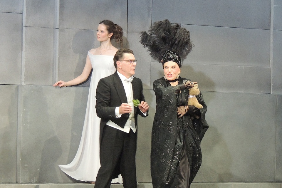 Комических картин в этом спектакле много: сватовство княжны Марьи «с препозицией». Сцена, в которой Пьер Безухов, убедившись, что его жена Элен ему неверна, бьет ее табуреткой. Семья Ростовых на цыпочках и мелким шагом спешит на первый бал Наташи. Во время бала огромная стена (основной элемент сценографии) на заднике отодвигается, чтобы впустить вальсирующие пары. Но пара только одна – Наташа и князь Андрей. А после бала – послевкусие: «Прекрасный бал. А этот седой голландский посланник. А этот Болконский, терпеть его не могу, а гордость такая, что без границ», – в полудреме перемывает кости Марья Игнатьевна (Максакова). В следующий раз она едет с Ростовыми в театр. Одетая в платье «в эпохе» с игрушечной собачкой в руках, она выходит на сцену и замирает там как средневековый рыцарь. Сцена в театре – шедевр. Влюбленной кошкой Наташа смотрит на Анатоля (Владимир Логвинов). Он ловит ее взгляд. Игра в гляделки – на пике крещендо (дают музыкальный спектакль). Граф Ростов как толмач рассказывает Марье Игнатьевне, что происходит на сцене. Она плохо видит, но еще слышит вполне: «Потише, дайте послушать!».