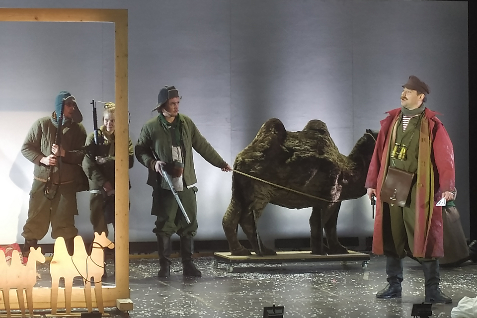 Атмосфера спектакля тонко выстроена на игре различных световых решений, появляющихся от лица Автора: ярким закатным лучом квадратной формы он подсвечивает то Марютку, то поручика в вечер их первого разговора; в полной темноте фонариком освещает небольшие деревянные фигурки верблюдов, чьи тени уходят караваном вдаль; проходится меж спящих красногвардейцев, озаряя лучом суть каждого.