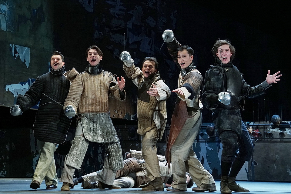 В постановке заняты не только артисты Художественного театра, но и студенты Школы-студии МХАТ. Они не массовка, они — поэты, лакеи, мушкетёры, капуцины, бароны, монахи, виртуозные музыканты… Даже солидный ректор Школы-студии МХАТ, педагог Игорь Золотовицкий не удержался и прочитал рэп. Он в роли графа де Гиша. Роксана в исполнении Паулины Андреевой поет нежным голосом нежные песни. Егор Перегудов, должно быть, посмотрел сериал «Оттепель», где Паулина сыграла певицу Дину и подумал: «Если Паулина мило поет в фильме Тодоровского, чего бы ей не спеть в моем спектакле?».