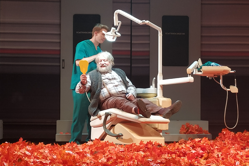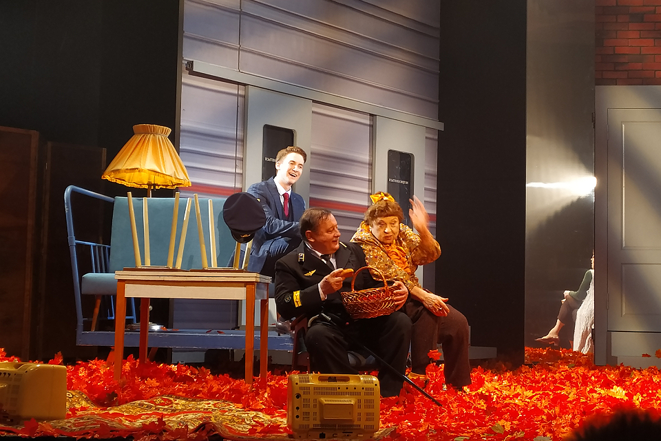 Спектакль «Женитьба. Почти по Гоголю» начинается, стоит лишь войти в малый зал Губернского театра: вся сцена и зрительный зал усыпаны багряными кленовыми листьями, низко стелится туман, пахнущий ещё солнечной прелой осенью и лёгкой прохладой, щебечут синицы и со свистом проносятся электрички.