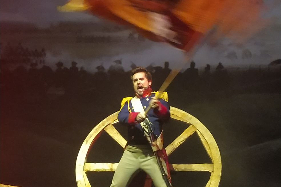 Интерактивный фоновый занавес усиливает эффект присутствия и расширяет пространство театрального действия. Тут возникает и уходящее в даль Бородинское поле, осыпаемое взрывами, и яркие графские комнаты. Отвечающие эпохе костюмы актеров помогают им глубже раскрыть характеры толстовских персонажей.