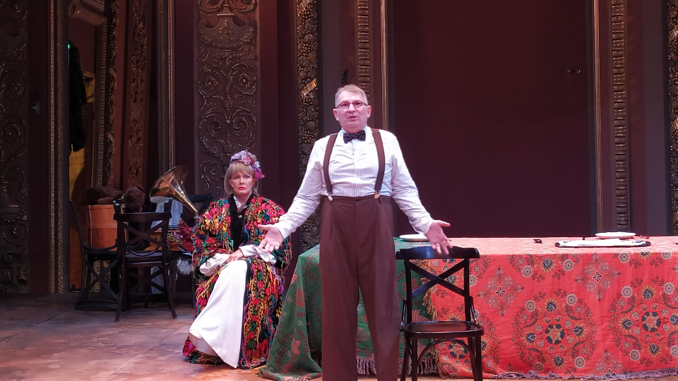 Все действие постановки происходит за праздничным обедом, однако актеры, уходя со сцены как бы в другое пространство квартиры, входят в большой платяной шкаф. Это символизирует погружение героя во внутренний мир, мир переживаний, где он заготавливает свое очередное откровение.
