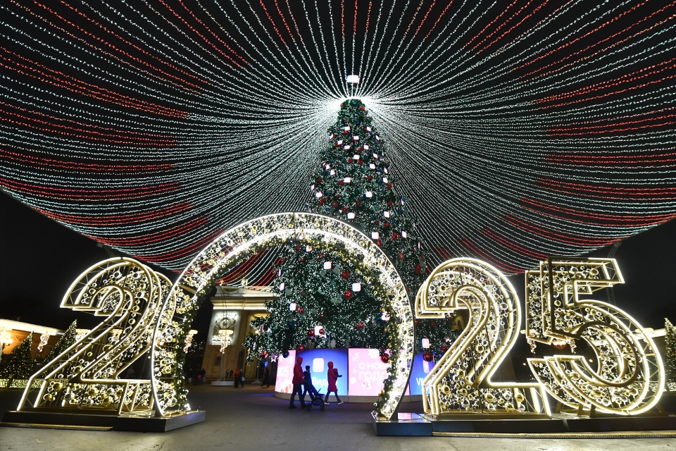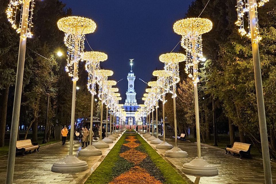 На ВДНХ установили световой елочный шар около главного входа и световой тоннель из арок-«кокошников» перед Центральным павильоном. С обеих сторон появились полумесяцы с мини-планетами из сотен ярких лампочек. Также можно было встретить сияющие «бокалы» и световой елочный шар. Вместе они создали целый тоннель, в котором получаются отличные новогодние снимки. Инсталляцию дополнили и другие золотистые объекты.