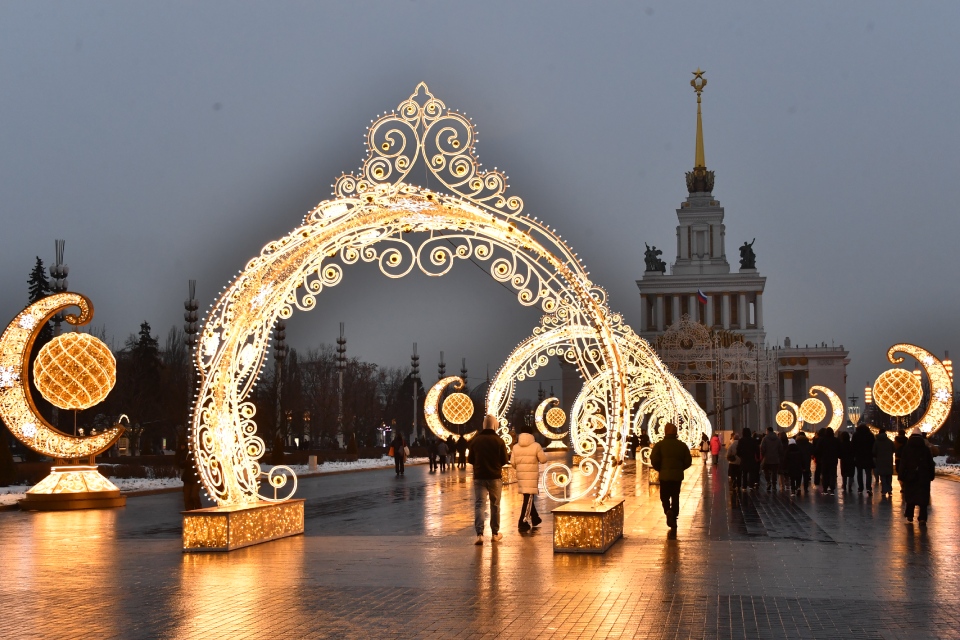 На ВДНХ установили световой елочный шар около главного входа и световой тоннель из арок-«кокошников» перед Центральным павильоном. С обеих сторон появились полумесяцы с мини-планетами из сотен ярких лампочек. Также можно было встретить сияющие «бокалы» и световой елочный шар. Вместе они создали целый тоннель, в котором получаются отличные новогодние снимки. Инсталляцию дополнили и другие золотистые объекты.