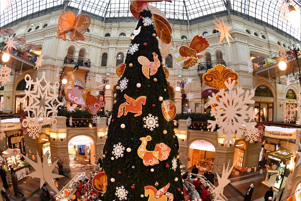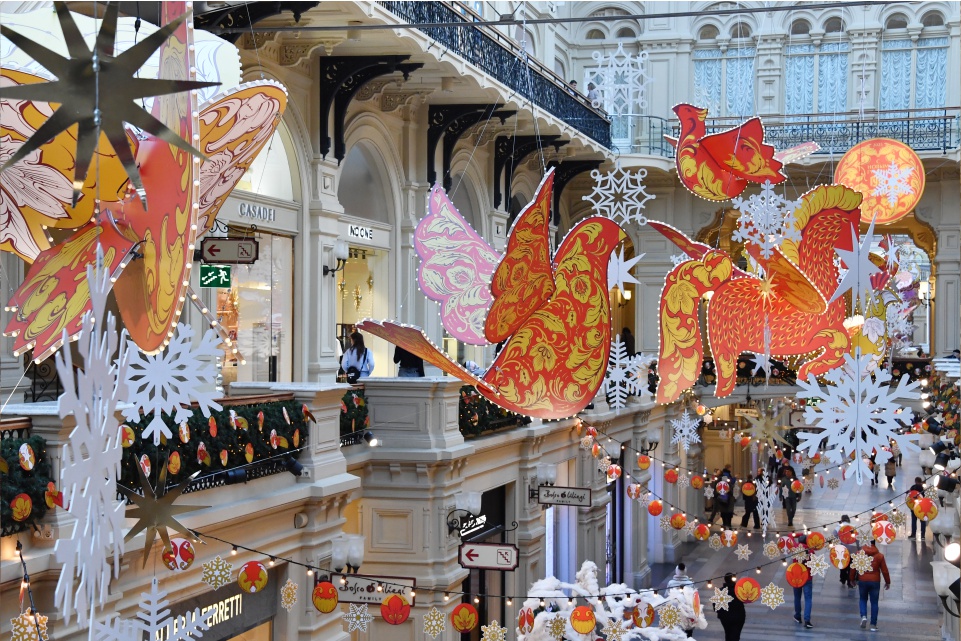 По традиции к Новому году преобразился и ГУМ. В том году выбрали украшения в стиле старинного народного промысла — хохломы.