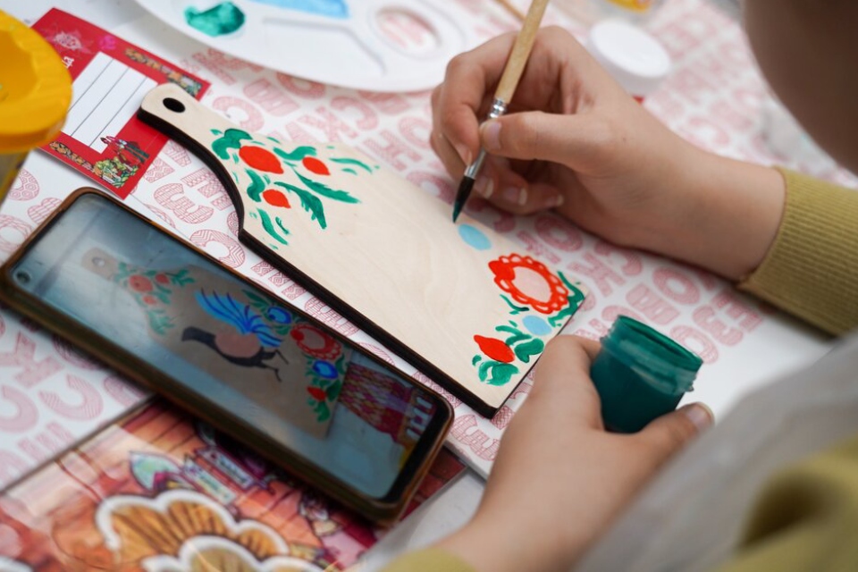 Гости познакомились с миром народного творчества в шале художественных ремесел, где их научили расписывать предметы быта в стиле гжель, шекснинской золоченки и освоили узоры, характерные для разных регионов России. Например, можно было создать шкатулку с гжельской росписью или тульскую кружку. Ценителей традиционных ремесел также ждали на занятиях по росписи керамики в стиле дымковской и филимоновской игрушек.