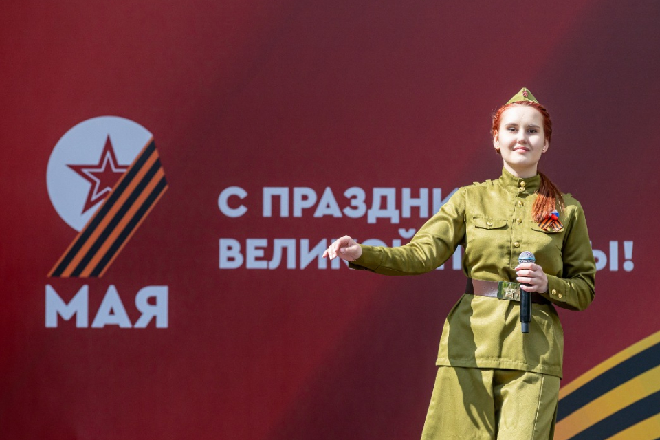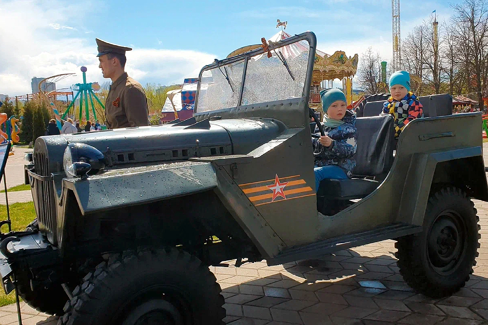 Праздничную программу проводят на центральной площади (ориентируйтесь на колесо обозрения). Детские коллективы столицы исполняют песни военных лет, танцуют и развлекают гостей. Рядом работает полевая кухня. А еще можно присоединиться к мастер-классу, где научат делать самолетики из бумаги, или посмотреть выставку ретротехники — автомобилей семейства ГАЗ.