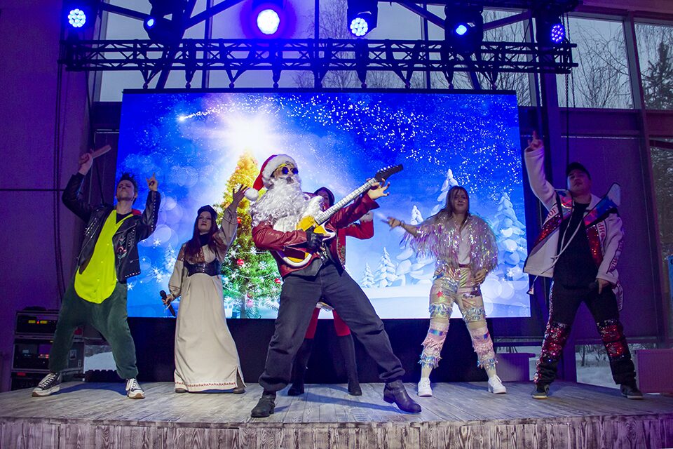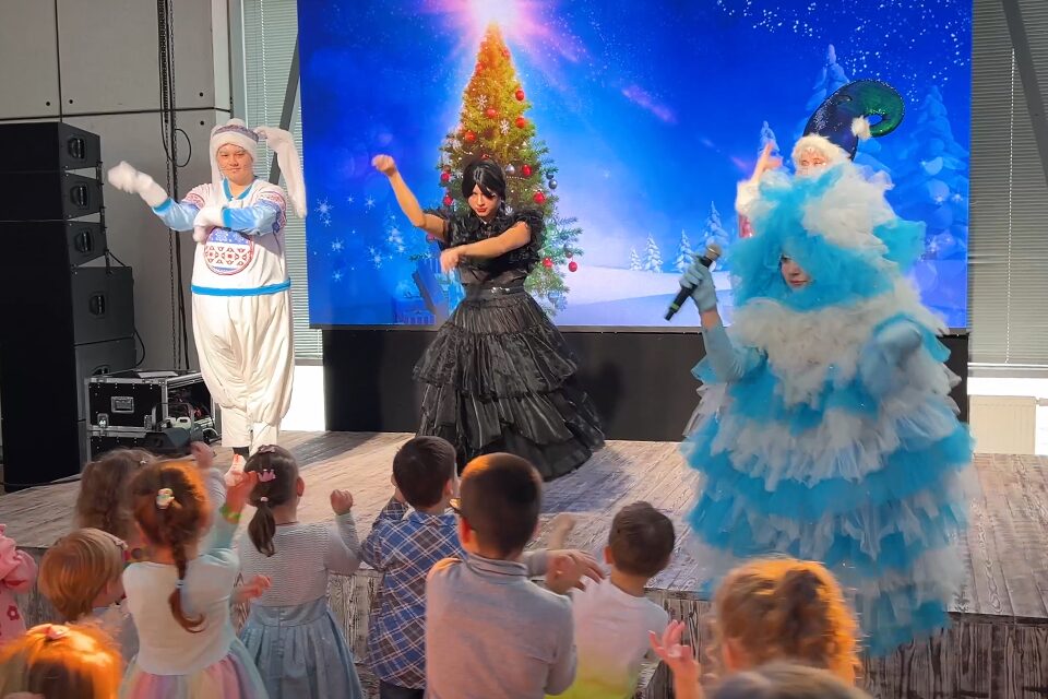 Детский рок-мюзикл представил оригинальное прочтение праздника. Зрители отправились в увлекательное путешествие вместе с саунд-продюсером Зайцем и восходящей к вершине Елочной суперзвездой. По дороге они встретили самых популярных персонажей прошедшего и наступающего года – Уэнсдей, Барби, Дракона и ответили на вопрос: какой он, современный Дед Мороз? В программе были танцы, песни и конкурсы. Каждый юный участник получил подарок со сладостями и билетом в «Дино парк».