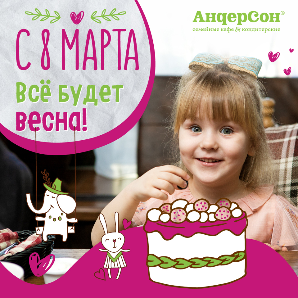В сети семейных кафе «АндерСон» в эти праздничные дни приготовили сладкие угощения, атмоферные мастер-классы и, конечно, весеннее настроение. Каждая посетительница получит живые тюльпаны и открытку-малышку в подарок.