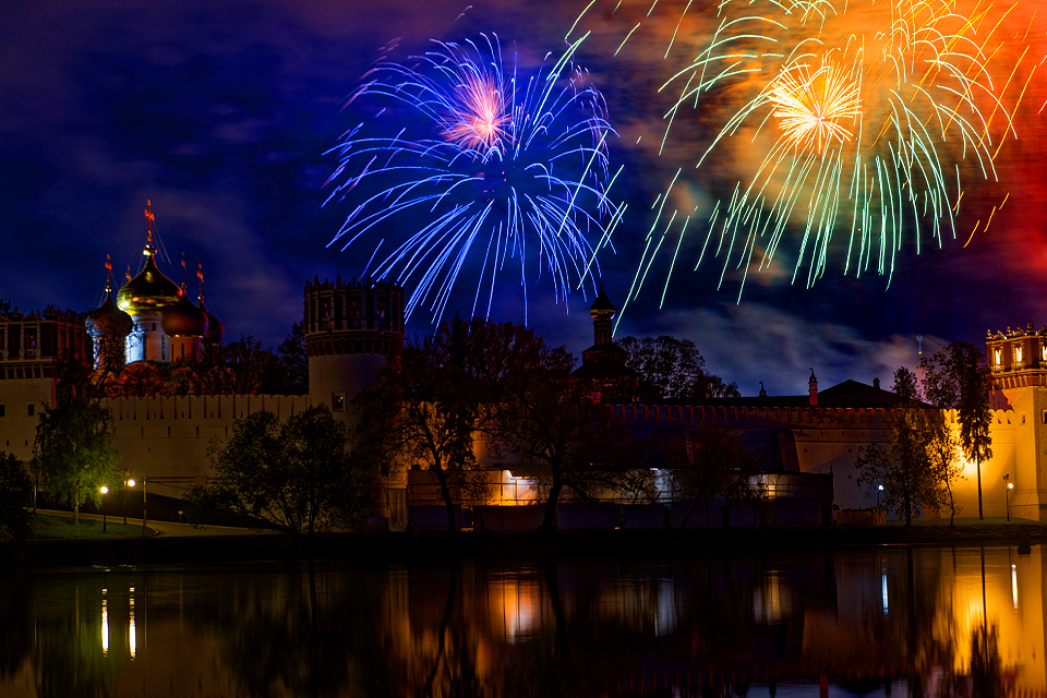 Обычно салют начинается в 22:00 по Москве и длится около 10 минут.