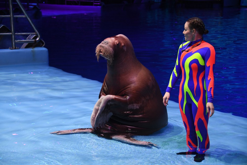 Под куполом появляются «красные цветы», а точнее цирковые артисты, которые на высоте 10 метров над зрительным залом совершают сложнейшие трюки. Следом в гигантской водной чашей выступают дельфины.