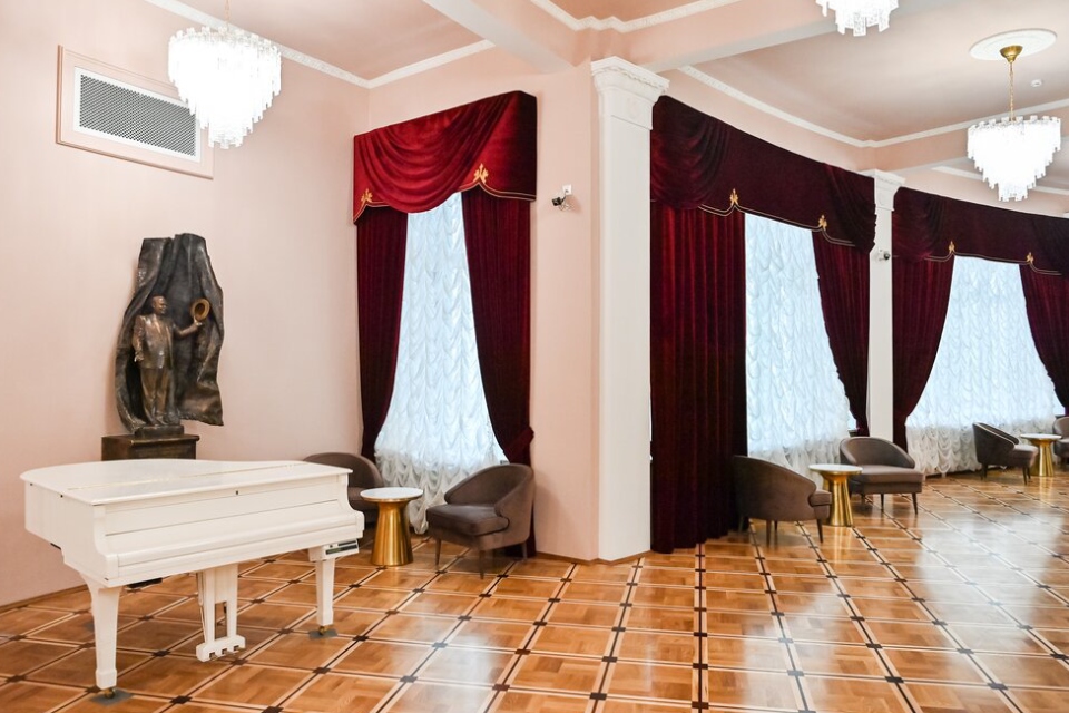 Гости увидят колоннаду портика и пилястры, паркет с оригинальным геометрическим рисунком, воссозданный реставраторами, гипсовый лепной декор и потолки, а также терразитовую штукатурку фасада. Невероятным открытием стала уникальная живопись в фойе первого этажа, скрытая под слоями краски. На стенах изображены ромбы с цветочными розетками, а по периметру свода — растительный орнамент. Цветовая гамма меняется от теплого розового у основания до холодного оттенка в центре. Венчает композицию лепная розетка круглой формы.