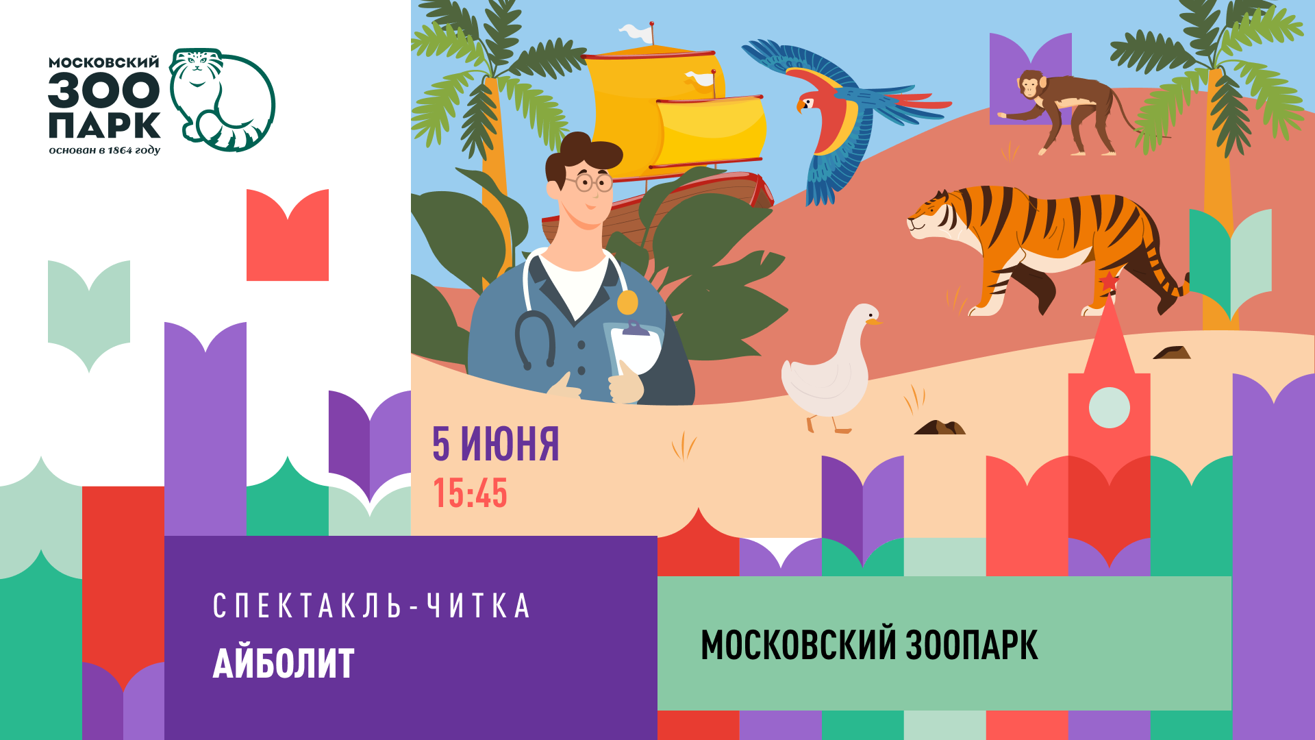 Московский зоопарк примет участие в большом книжном фестивале «Красная площадь» и представит спектакль-читку «Айболит». Увидеть постановку можно 5 июня в 15:45 на малой сцене. Вход на фестиваль, следовательно и на спектакль свободный.