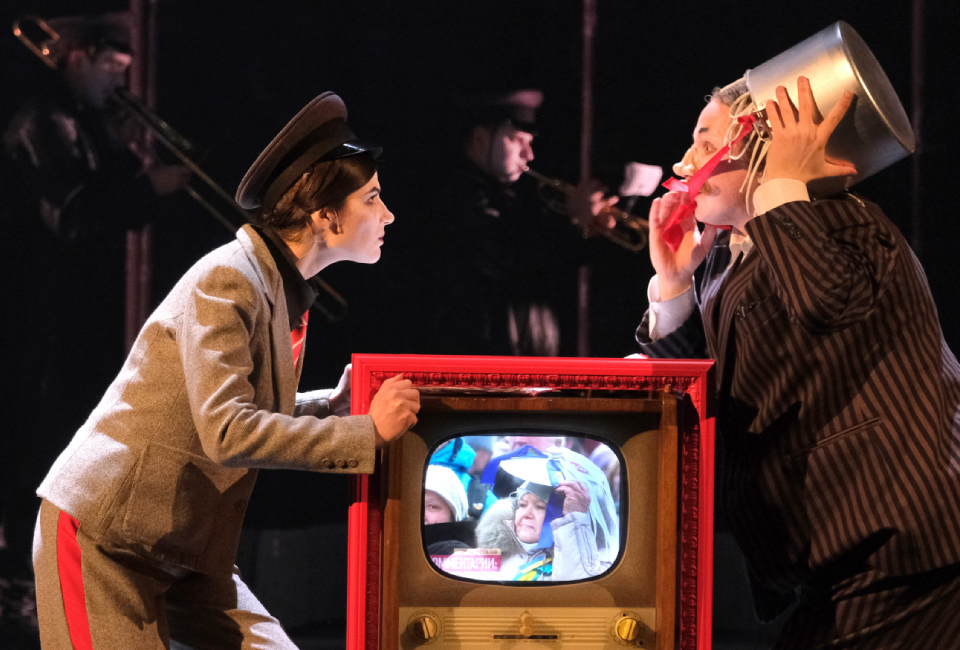 На сцене, на фоне кроваво-красных занавесов и одинаковых коммунальных дверей, высятся красочные конструктивистские лестницы-трансформеры. Именно к ним в прологе пьесы герои выстраиваются в безмолвной очереди, держа в руках свои чемоданы, словно они отправляются на борт корабля, символизируя начало 20-х годов и волну эмиграции того времени. А завершается пьеса предчувствием молота репрессий 30-х.